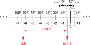 Agora veja… HLE é a hora determinada pelas leis de um estado. Essa hora abrange 7º30’para cada lado de um meridiano central. Em outras palavras, seja qual for a longitude dentro desses 15º (7º30′ para cada lado) a hora será a mesma. Veja figura abaixo.